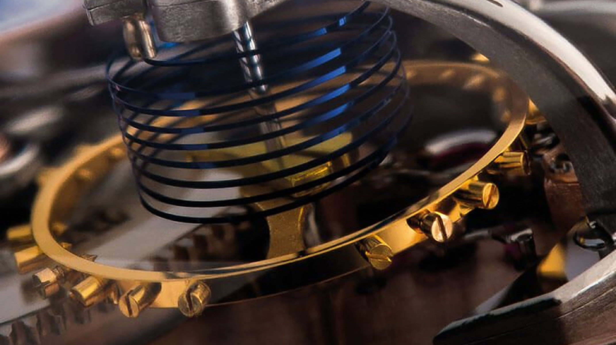 Entire calibre hand-finished, traditionally buffed and polished corners, rounded and hand-polished balance bridge and sweep second cock, escapement wheel, black-polished endstones, rounded and moveable Geneva hairspring stud holder. Moulded, ringed and bevelled wheel and intermediate wheels, black- polished and hand-blued screws, numbered calibre.