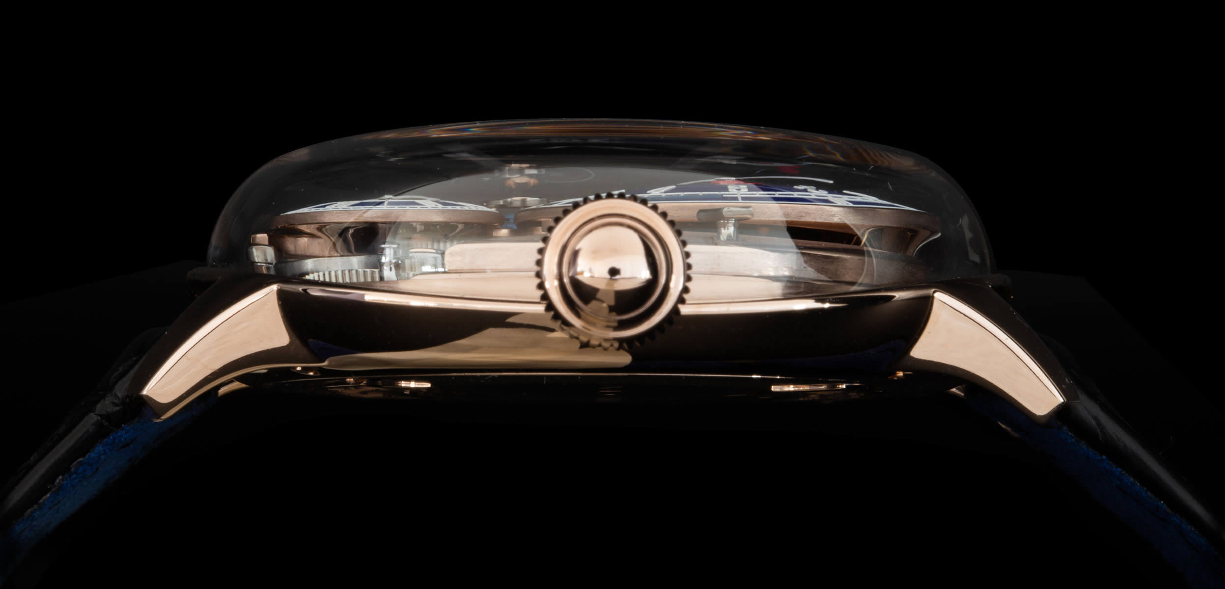 On the opposite side, between 2 and 3 o’clock, the selected function is indicated: W (Wind) or S (Set). The hour dial, made from “Grand Feu” enamel or stone, is placed at 12 o’clock, and displays the hours (red hand) and minutes (white hand), while the seconds are displayed off-centre at 6 o’clock. The ring, calibrated into 60 trailing seconds, covers the two barrels of the Cu29.